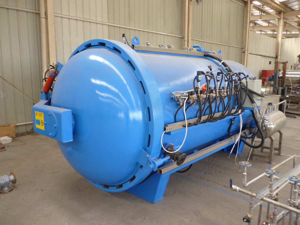 主要工作原理:采用幾組特制的不銹鋼散熱管分布在罐壁控制加熱。蒸汽由罐后2組自動(dòng)閥門進(jìn)入到罐內(nèi)的散熱片中,散熱管按規(guī)則排列在罐體的上下左右方,高溫風(fēng)機(jī)通過溫度循環(huán)板將熱量由后至前均勻分散,熱量推進(jìn)至罐門后返回風(fēng)機(jī)導(dǎo)流罩處,循環(huán)風(fēng)道促使罐內(nèi)熱量更均勻的循環(huán)和擴(kuò)散,優(yōu)化熱循環(huán)和熱傳導(dǎo)效率,熱量在罐內(nèi)來回循環(huán),形成均勻的溫度場(chǎng),溫度均勻無死角,壓力恒定。解決了罐內(nèi)產(chǎn)品因溫度和壓力不均勻,而造成產(chǎn)品質(zhì)量的差異,設(shè)定工作程序后,控制系統(tǒng)自動(dòng)進(jìn)行升溫、保溫、硫化等工作,硫化結(jié)束后自動(dòng)斷電并發(fā)出聲光報(bào)警音提示。采用這兩種加熱方式,都需要額外配備鍋爐,產(chǎn)生蒸汽硫化。