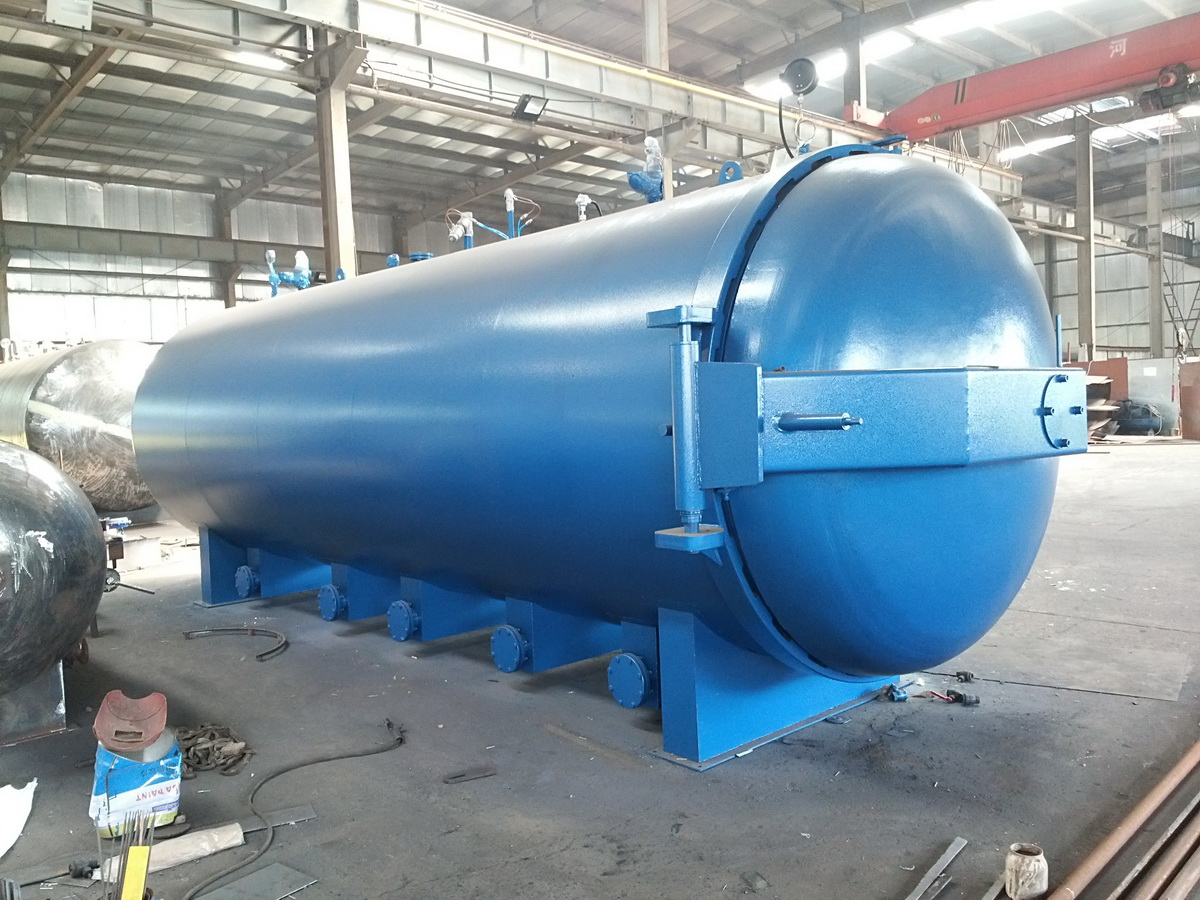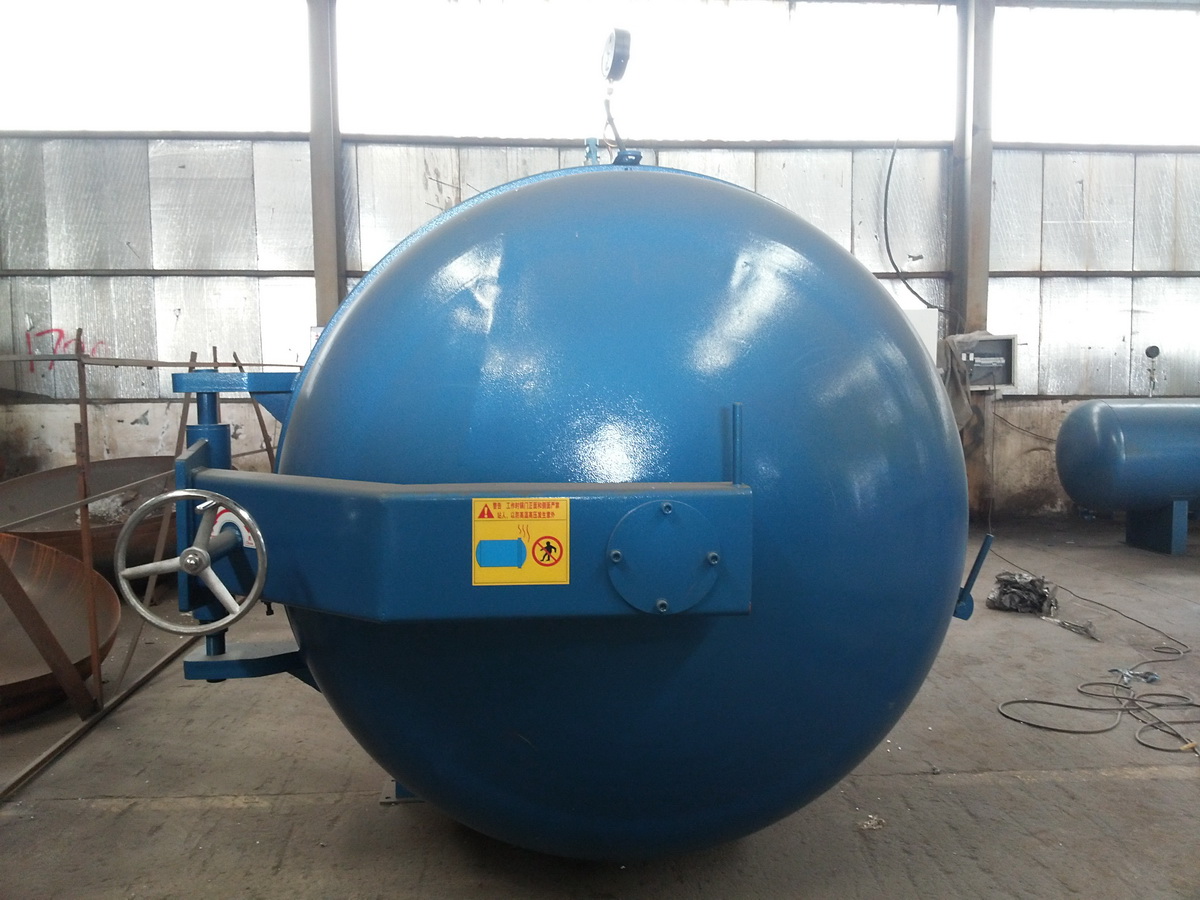 主要工作原理:采用幾組特制的不銹鋼散熱管分布在罐壁控制加熱。蒸汽由罐后2組自動閥門進入到罐內的散熱片中,散熱管按規(guī)則排列在罐體的上下左右方,高溫風機通過溫度循環(huán)板將熱量由后至前均勻分散,熱量推進至罐門后返回風機導流罩處,循環(huán)風道促使罐內熱量更均勻的循環(huán)和擴散,優(yōu)化熱循環(huán)和熱傳導效率,熱量在罐內來回循環(huán),形成均勻的溫度場,溫度均勻無死角,壓力恒定。解決了罐內產品因溫度和壓力不均勻,而造成產品質量的差異,設定工作程序后,控制系統(tǒng)自動進行升溫、保溫、硫化等工作,硫化結束后自動斷電并發(fā)出聲光報警音提示。采用這兩種加熱方式,都需要額外配備鍋爐,產生蒸汽硫化。
