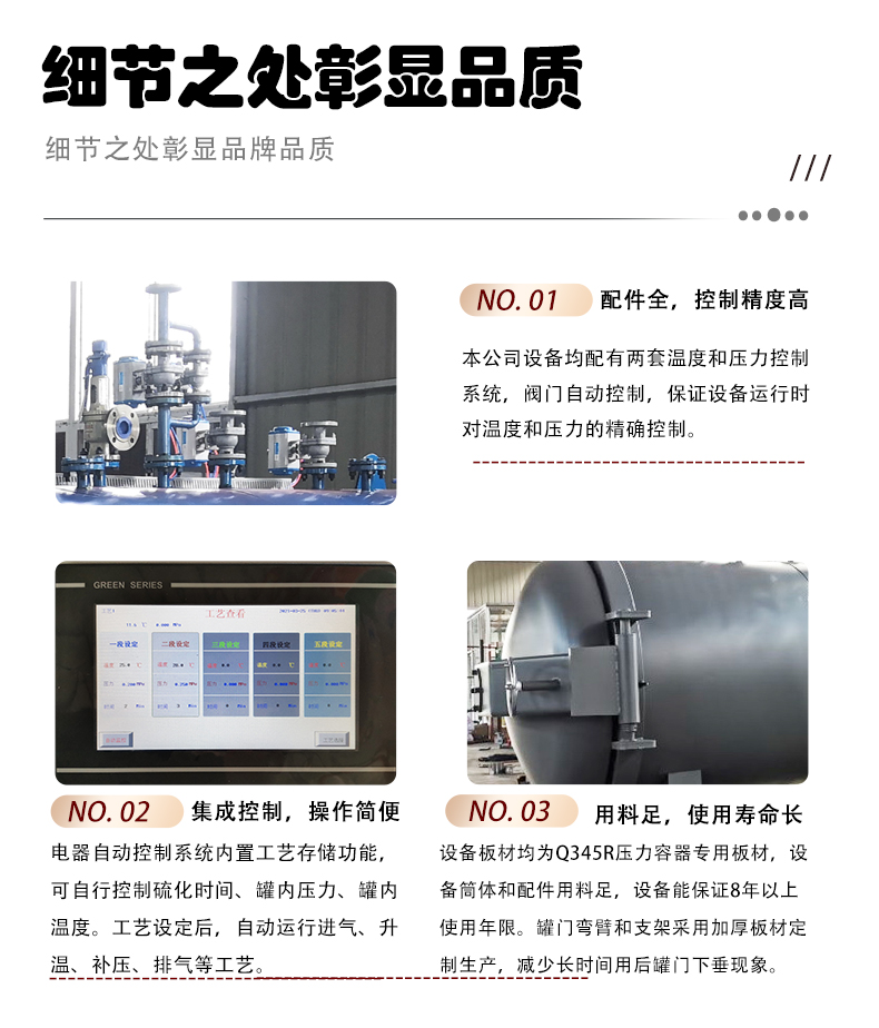 (2)自動(dòng)控制:控制系統(tǒng)可以將整個(gè)硫化過程完全排除人工參與,從升溫、保溫、硫化等均由自動(dòng)完成。全部流程只需打開控制開關(guān)即可實(shí)現(xiàn)。省時(shí)省心省成本,產(chǎn)品確保質(zhì)量。